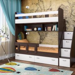 Двухъярусная кровать «Юниор 1» от ЯРОФФ, представленная в каталоге детской многофункциональной мебели, станет отличным решением при обустройстве комнаты ребенка, а также его стильным и ярким, оригинальным дополнением. Двухъярусная кровать-чердак «Юниор 1» выполнена в сочных оттенках, при этом вы легко можете выбрать наиболее подходящую расцветку каркаса и фасада, которая оптимально впишется в ваш интерьер и будет соответствовать пожеланиям как родителей, так и хозяина комнаты. У кровати два спальных места, на втором этаже имеется бортик для безопасности. Выкатные ящики под спальным местом на нижнем ярусе и в лестнице позволяют разместить все необходимые вещи и поддерживать порядок в комнате.